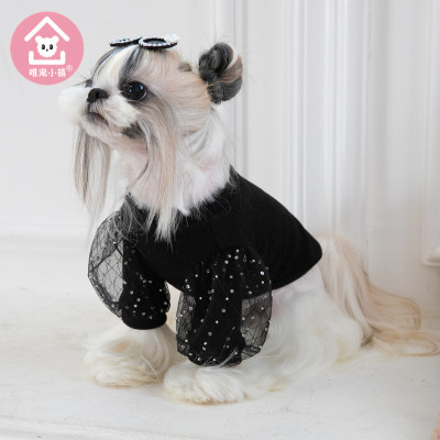 K743.15 中小型犬の服 Tシャツ-米珠蕾丝泡泡袖 サイズM 黑色 black ブラック